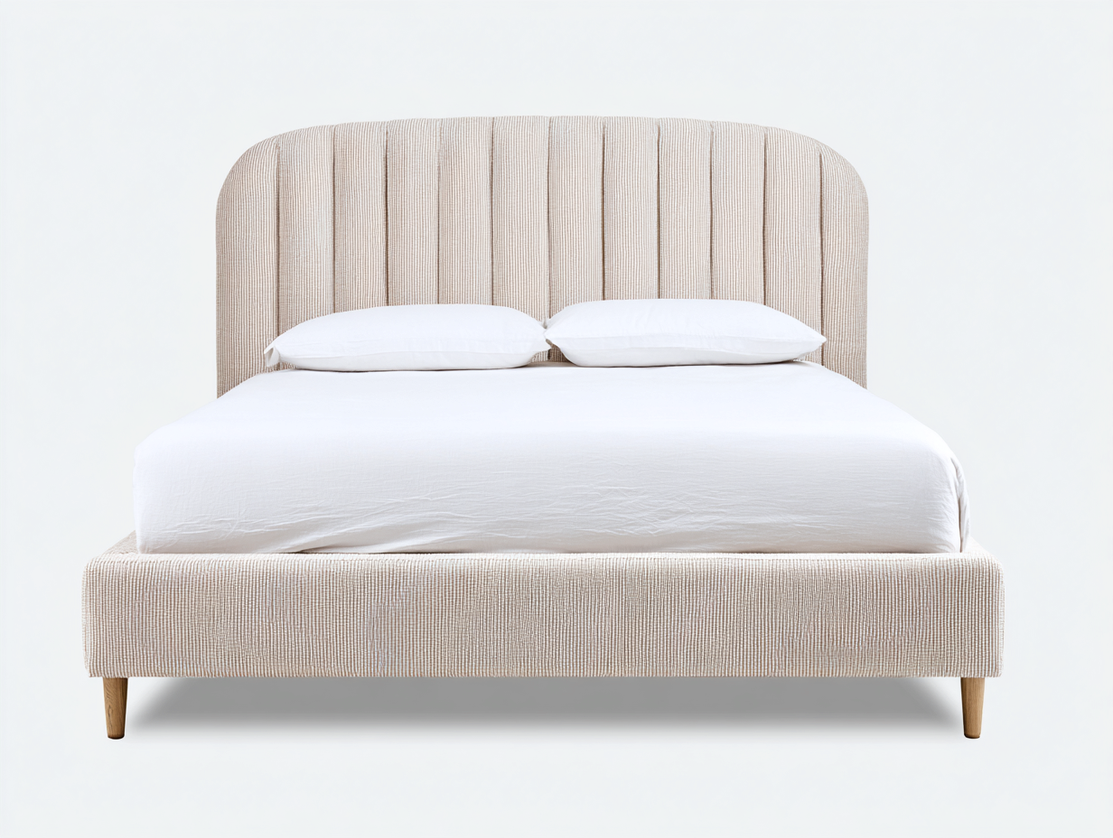 Questo letto matrimoniale imbottito si distingue per la testiera arrotondata con lavorazione verticale, offrendo una presenza visiva morbida e bilanciata nella zona notte. Le proporzioni compatte e il profilo pulito lo rendono adatto a interni moderni e contemporanei, garantendo una struttura stabile per l'uso quotidiano.