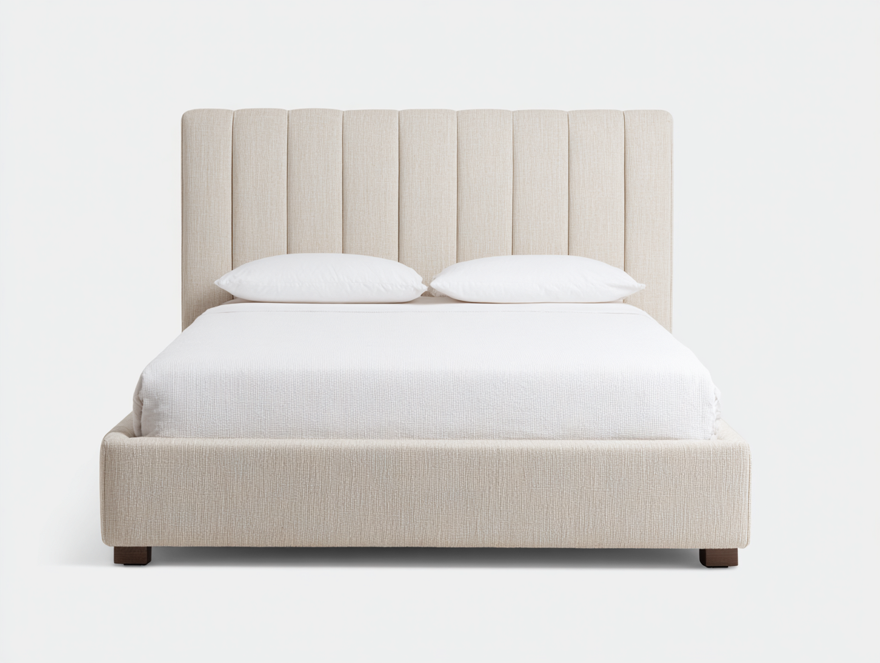 Questo letto matrimoniale imbottito presenta una testiera alta con canali verticali larghi, pensata per creare un aspetto ordinato ed elegante nella zona notte. Le proporzioni equilibrate e il volume compatto lo rendono adatto ad ambienti moderni e contemporanei, offrendo una struttura stabile e affidabile per l'uso quotidiano.