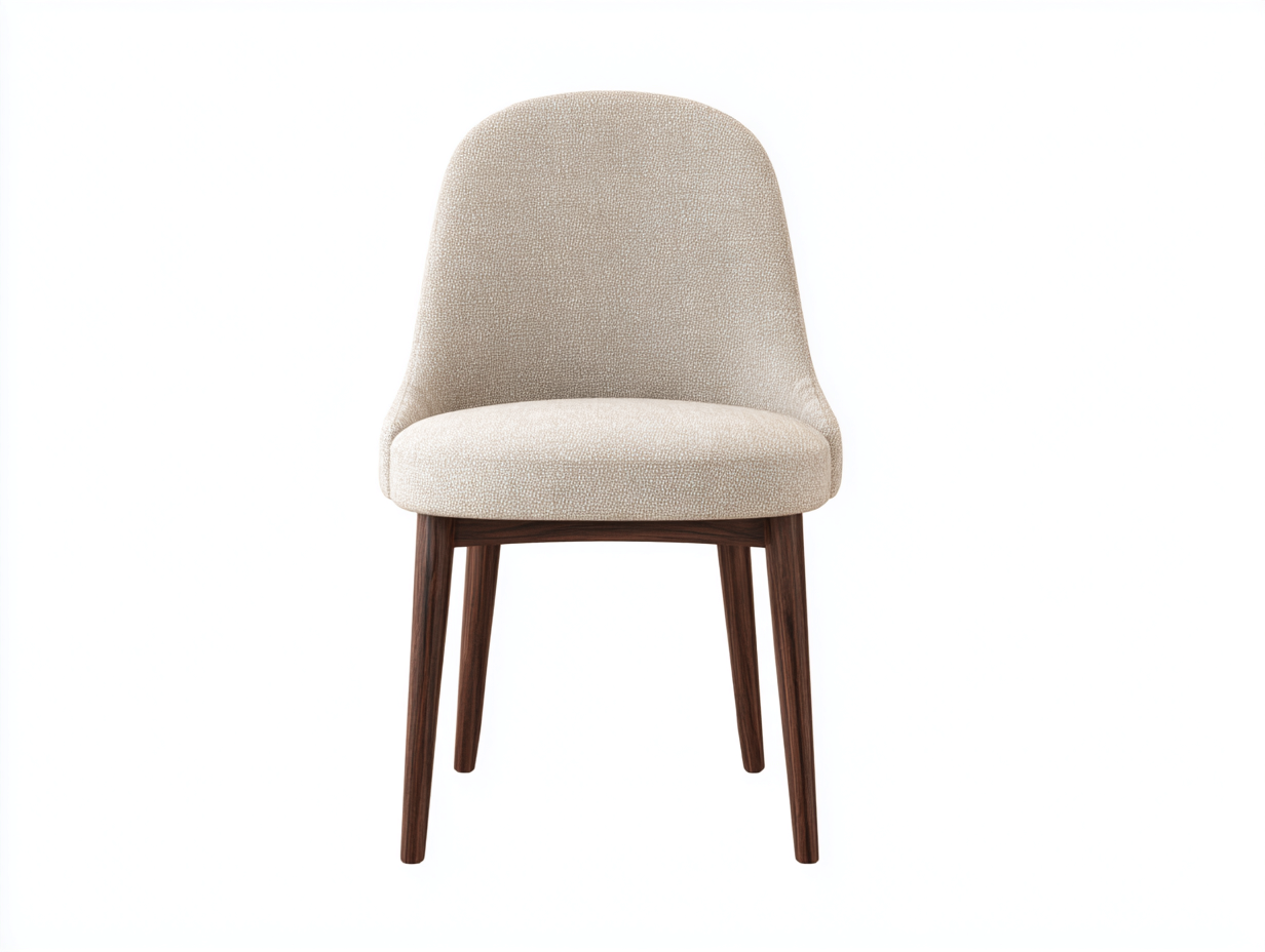 La seduta e lo schienale sono rivestiti in tessuto color beige chiaro con superficie uniforme e piacevole al tatto. La struttura è sostenuta da gambe in legno massello con finitura scura che assicurano solidità e resistenza.